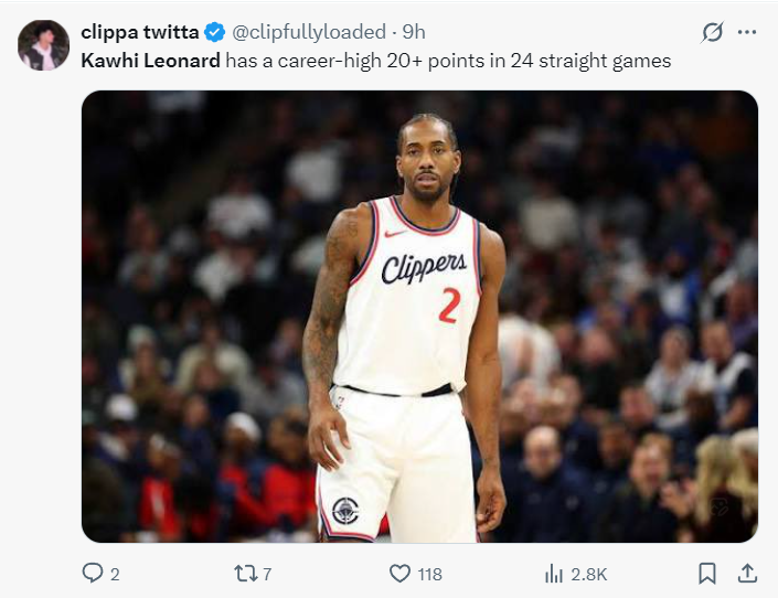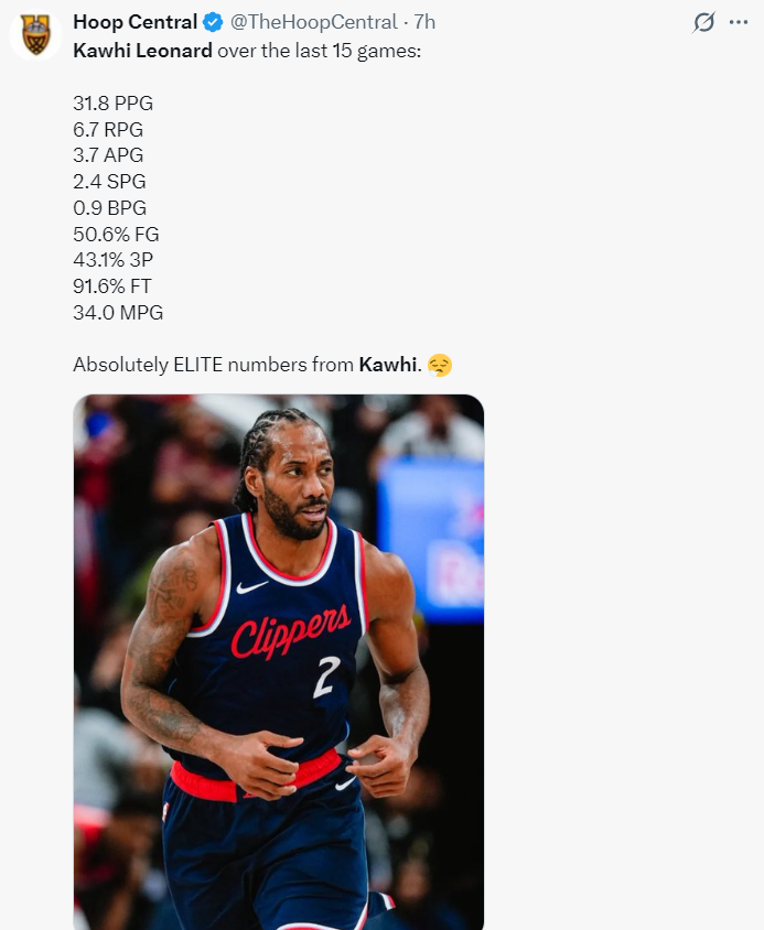 自12月20日以来小卡出战了15场比赛(缺席了三场),他场均达到32.1分联盟第一,这期间快船18场比赛赢下了其中的15场比赛,快船期间的战绩也是联盟第一。